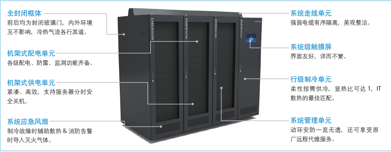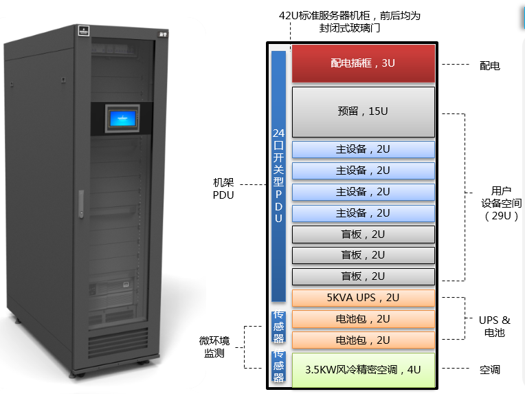 为保证整体工艺的一致性和无缝兼容,组成微模块的机柜、机架空调、UPS及供配电、动环监控等,须由同一家生产厂家提供