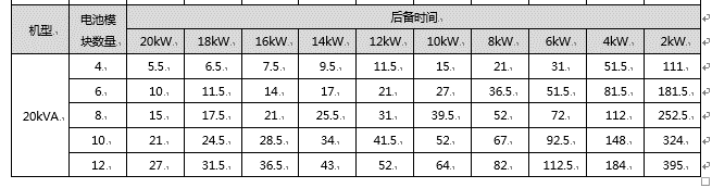 2, 20KVA UPS 的电池模块数量可以根据负载和备电时间长短进行修改,参照下面的备电时间表,电池模块超出12个后任然不能满足备电时间,需配置外置的电池组